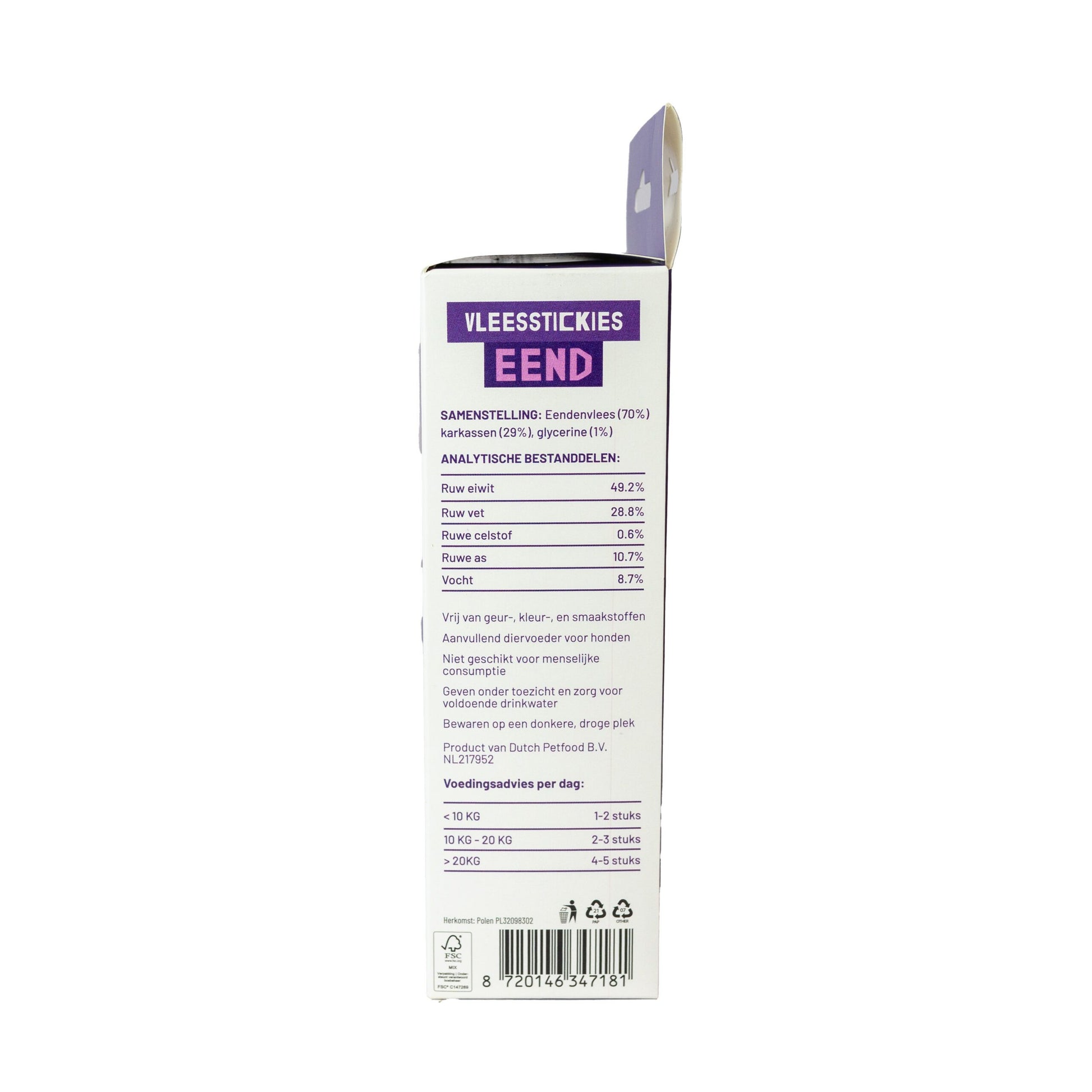 Eendenvlees 70%, karkassen 29%, glycerine 1%