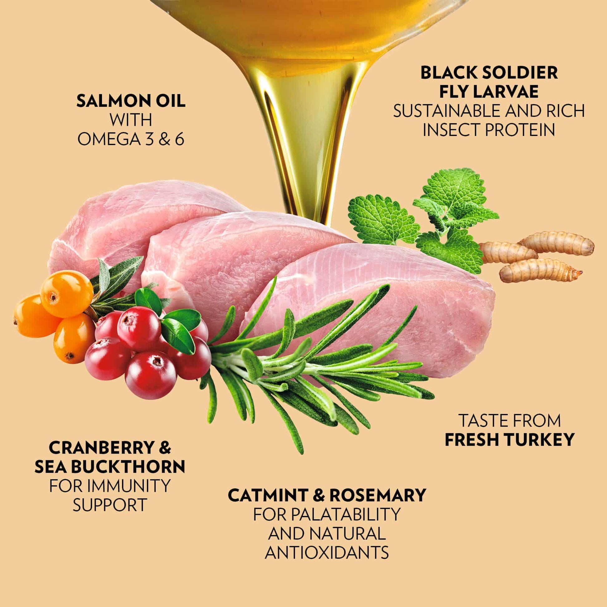 Verse kalkoen 26%, gedroogd kalkoeneiwit 22%, erwten 20%, kippenvet 7%, erwteneiwit 7%, insecteneiwit (Hermetia illucens-larven) 4%, lignocellulose 3%, gehydrolyseerde kippenlever 3%, zalmolie 2%, biergist 2%, natriumchloride 2%, psylliumschil en -zaden 1%, erwtenmeel 0,46%, gedroogde duindoorn 0,1%, gedroogde cranberry 0,1%, gedroogde kattenkruid 0,1%, gedroogde rozemarijn 0,1%, gedroogde kelp 0,1%, MOS 0,017%, FOS 0,014%, Yucca Mojave 0,009%.