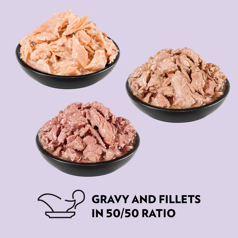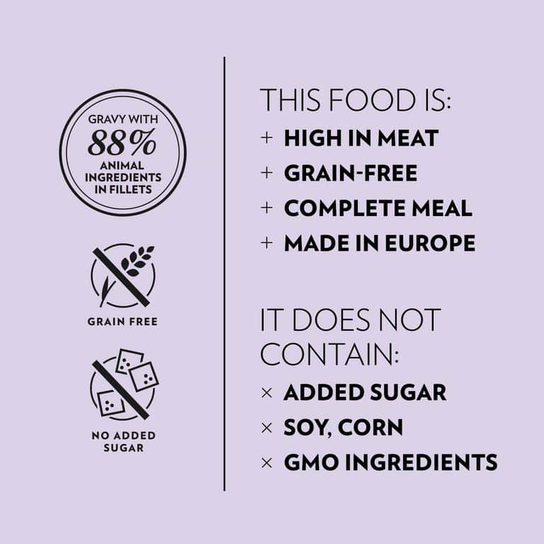 88% vlees en dierlijke producten in filets (min. 11% gevogelte), plantaardige oliën en dierlijke vetten, vezels (0,4% inuline), mineralen. Verhouding jus/filet 50/50