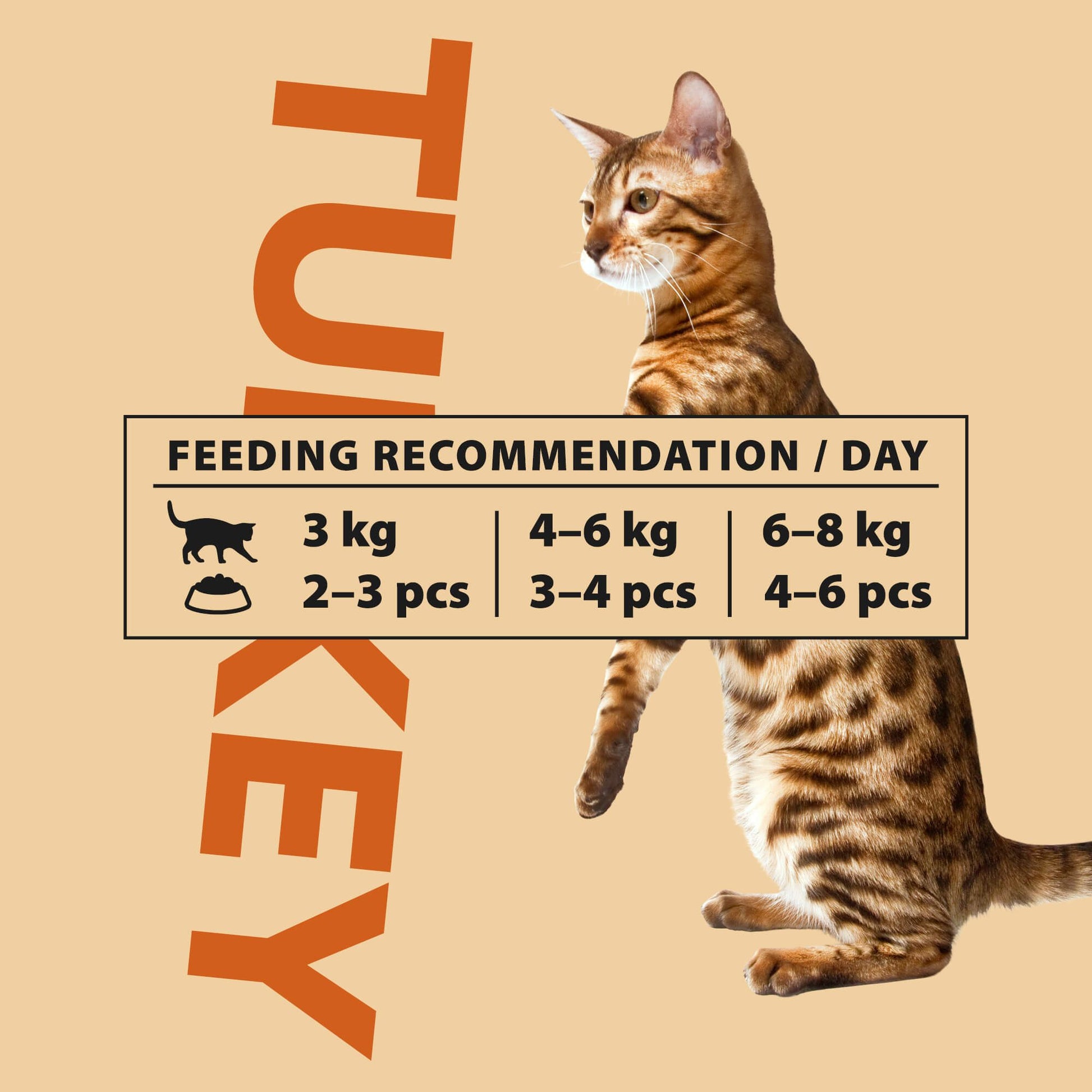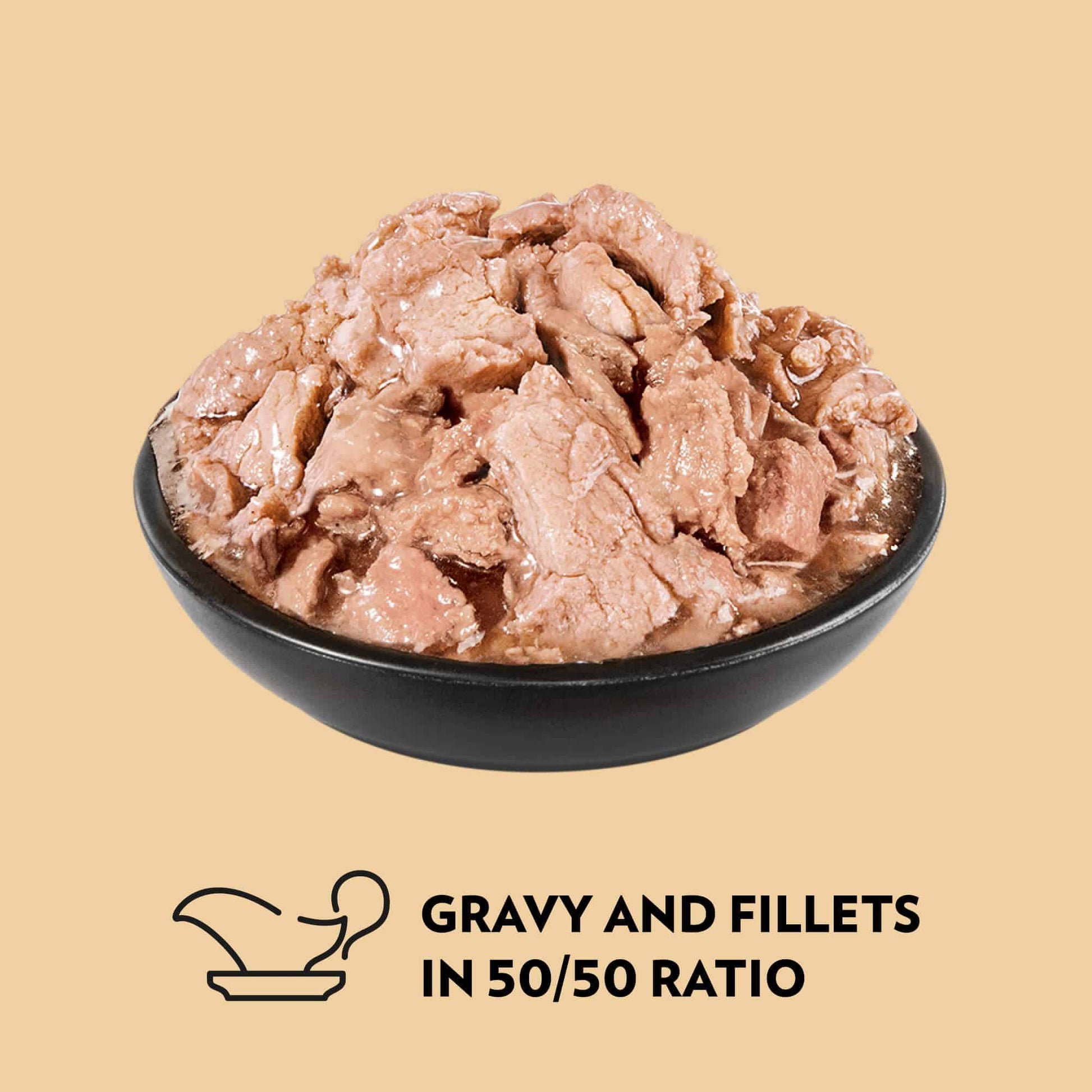 88% vlees en dierlijke derivaten in filets (11,6% kalkoen), mineralen, derivaten van plantaardige oorsprong (0,4% inuline), fruit (0,1% gedroogde cranberry). Verhouding jus/filet 50/50